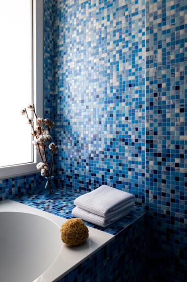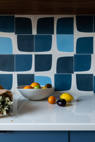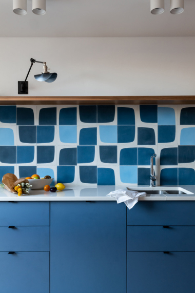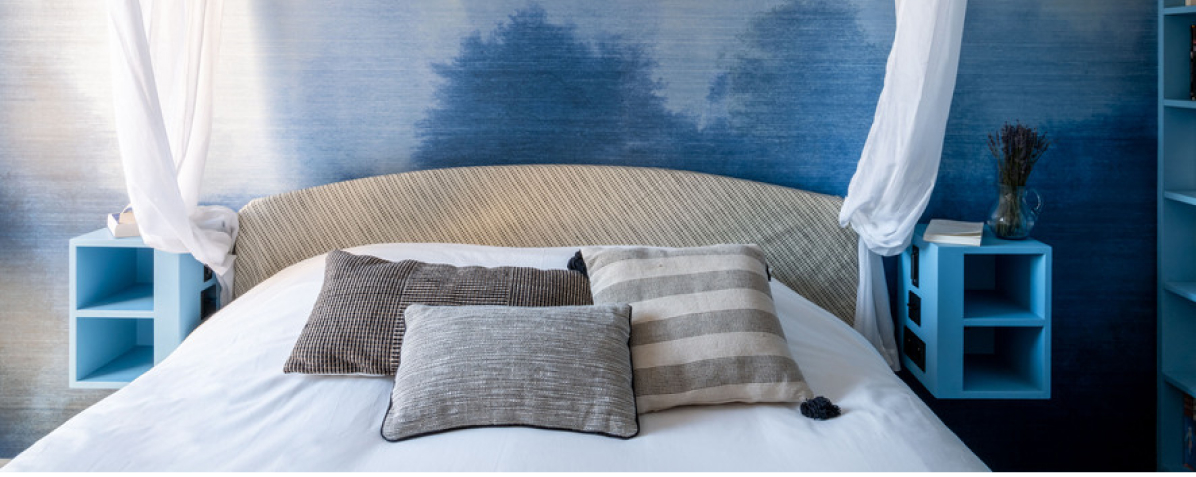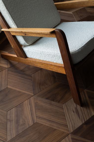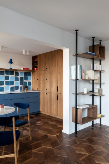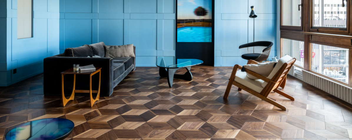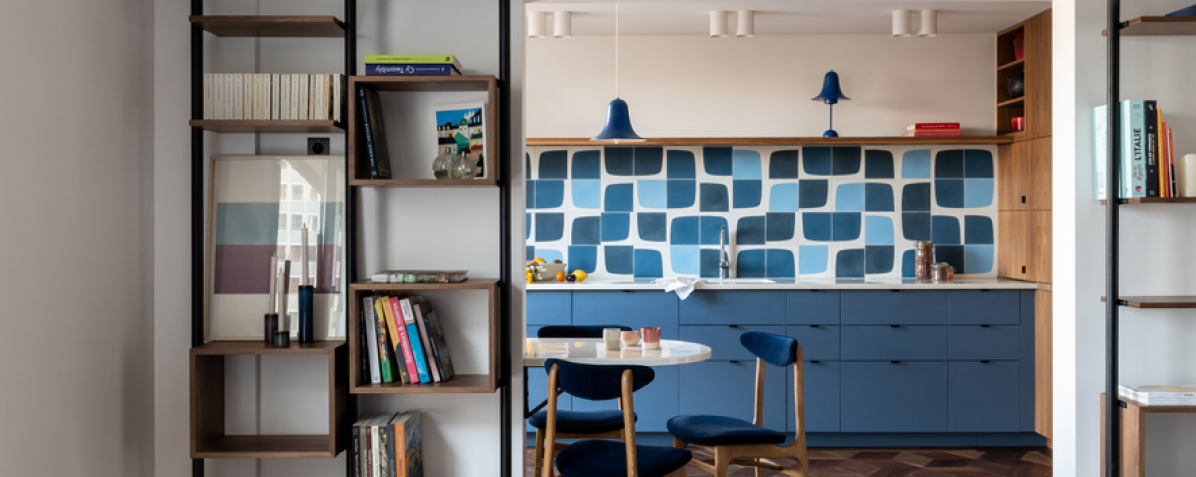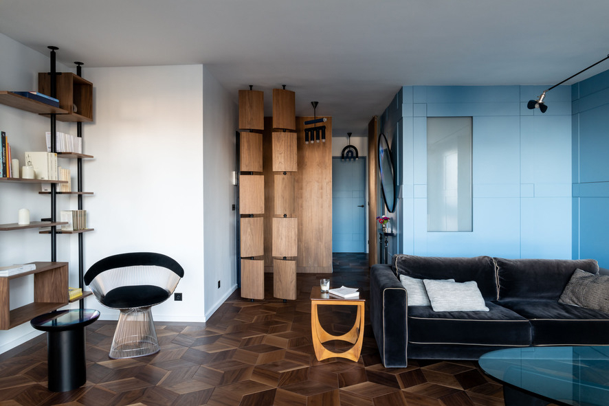 Marqueterie de noyer, symphonie de bleus, mobilier vintage et contemporain.